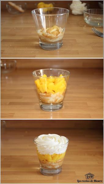 Añadimos el melocotón troceado y sobre este una buena capa de nata montada (crema de leche). Decoramos al gusto y ya tenemos nuestro triffle. Podéis ver el montaje del postre en las siguientes fotos: