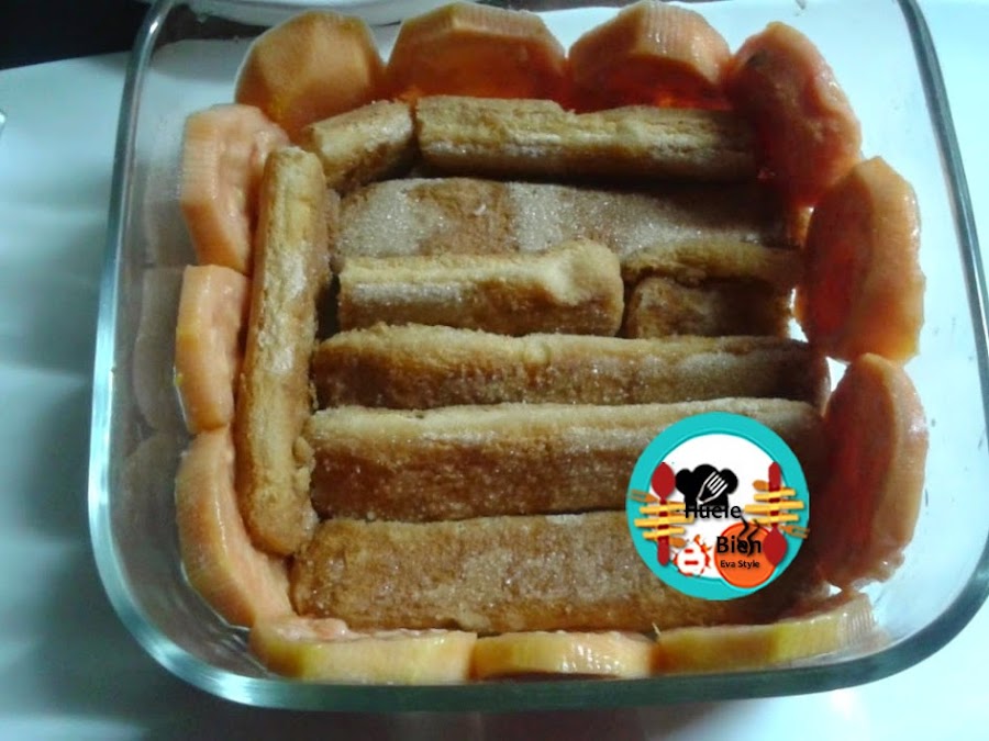 2.- En un recipiente de cristas, copa o algo similar montamos el postre. Ponemos una capa de galletas mojadas en el roiboos de primero. Pelamos y cortamos en rodajas los guayabos. Los ponemos de pie en el borde del cristal.