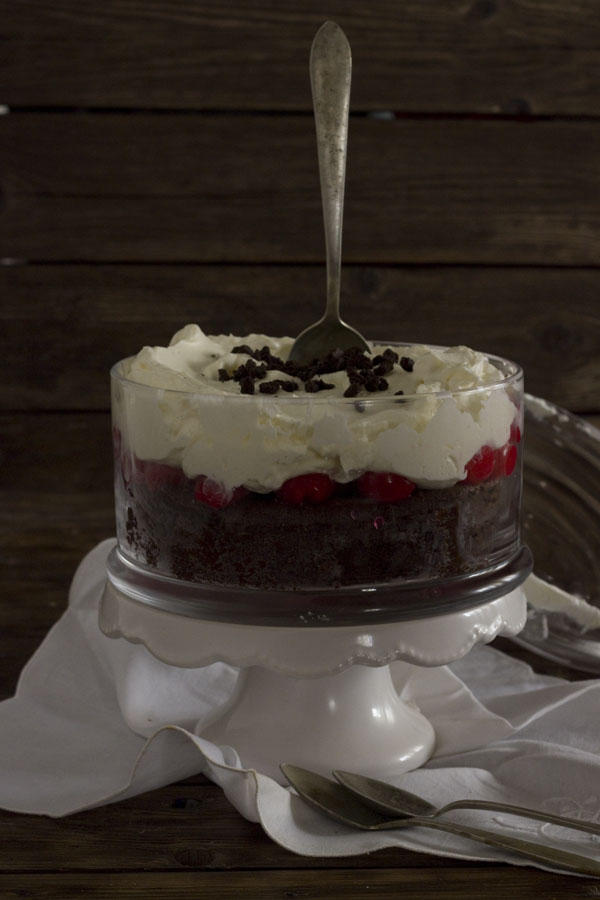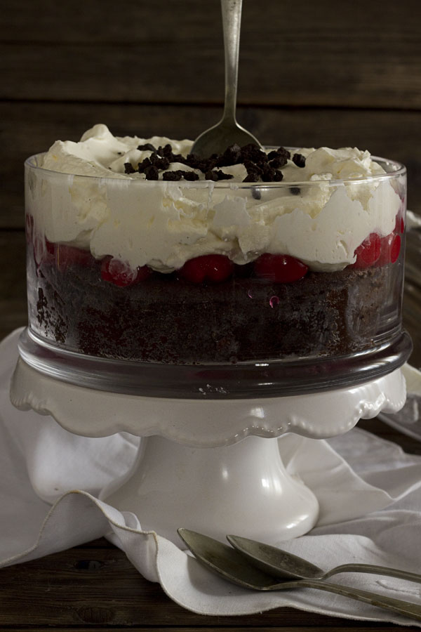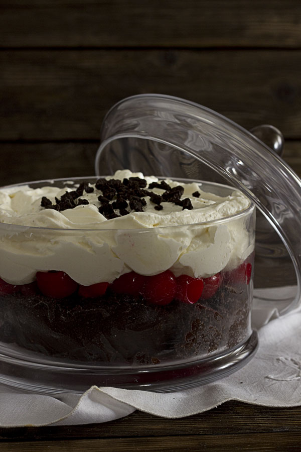 Cortamos el brownie con la forma del recipiente elegido, escurrimos en un colador durante un rato las cerezas y las colocamos encima del bizcocho y seguidamente ponemos la crema de queso y nata (crema de leche) sobre ello. Decoramos con los trozos de galletas oreo que vienen dentro del paquete.