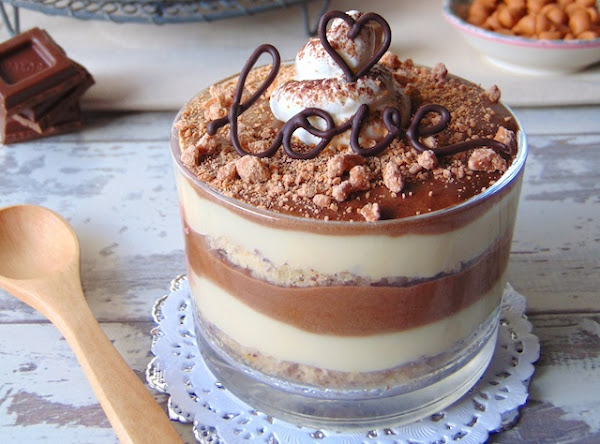 Montaje: coloca en vasos o en una fuente de vidrio amplia una capa bizcocho o galleta, luego una capa de crema de chocolate blanco, una capa de manzana con canela, un poco de nuez picada y un capa de crema de dulce de leche. Así sucesivamente hasta terminar con la crema que desees. Para adornar coloca un copo de crema batida y refrigera durante unos minutos