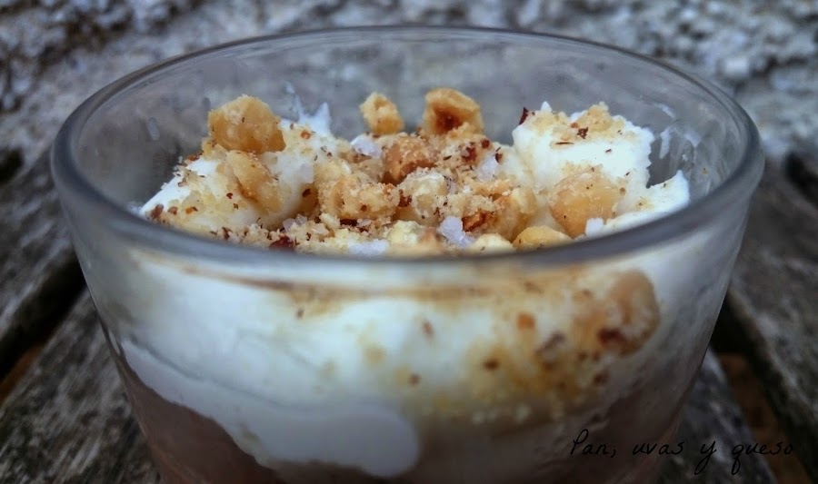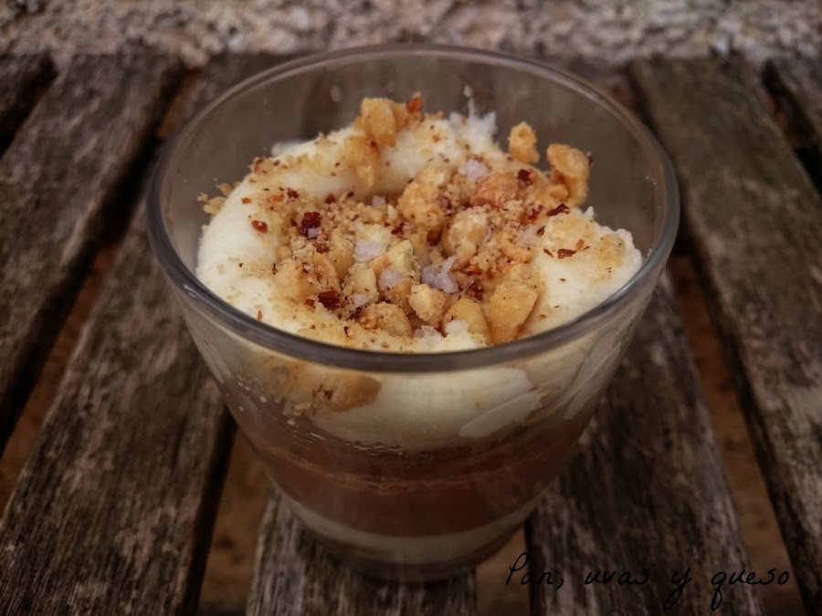 Terminamos el trifle picando las avellanas con el mortero. Repartimos las avellanas sobre el queso y ponemos unas escamas de sal en cada vaso.