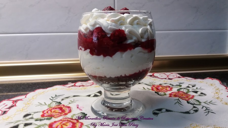 Seguidamente ponemos la nata montada (crema de leche) y así sucesivamente: Bizcocho-Coulís-Crema, poniendo otro piso más y terminando con unas cuantas frambuesas enteras por encima como decoración.