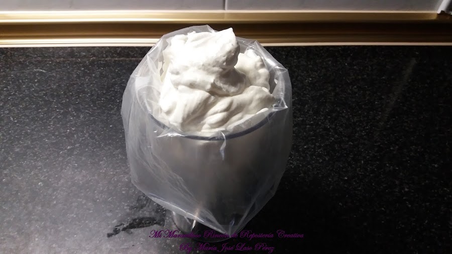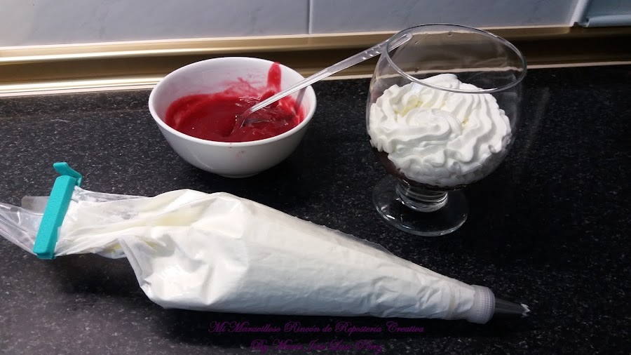 Colocamos la nata montada (crema de leche) en una manga desechable con una boquilla de estrella abierta y reservamos.