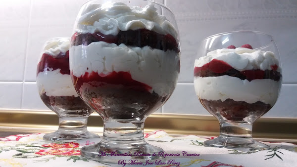 Ponemos en el fondo de cada copa una base de bizcocho de chocolate, que podemos regar con unas gotas de licor, si las copas las van a consumir adultos (opcional), y con zumo de fruta o almíbar, si son para niños.