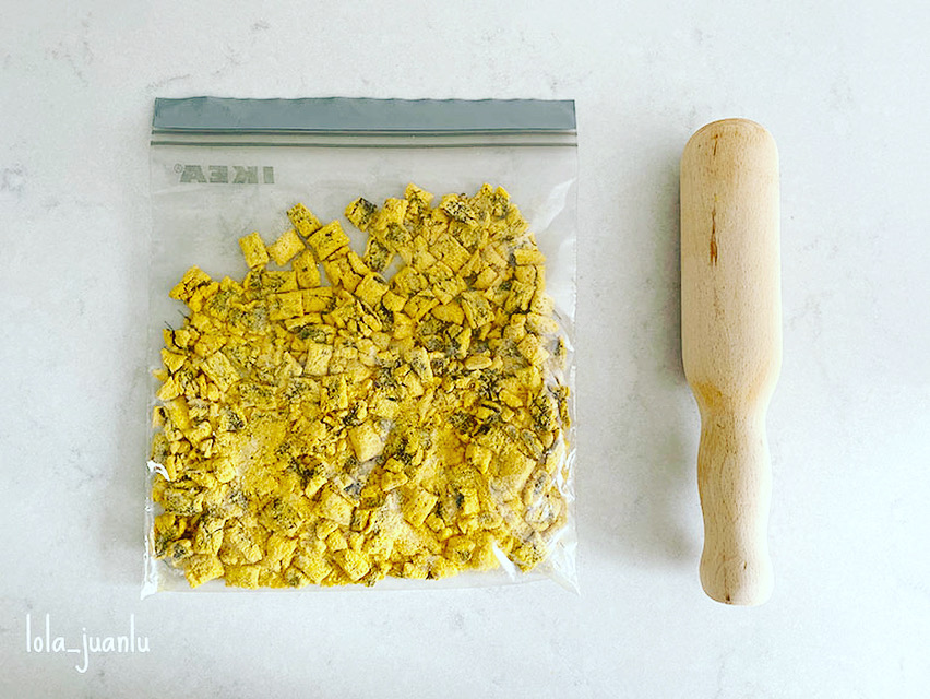 Nos ponemos con la capa crujiente. Rompemos las almohadillas de trigo, avena y arroz rellenas de chocolate negro en trozos muy pequeños o migas, para ello, las podemos meter en una bolsa y le damos con un rodillo o mortero. Me gusta hacerlo así más que hacerlo con ayuda de un procesador de alimentos o robot de cocina porque podemos obtener trozos más enteros. Reservamos.