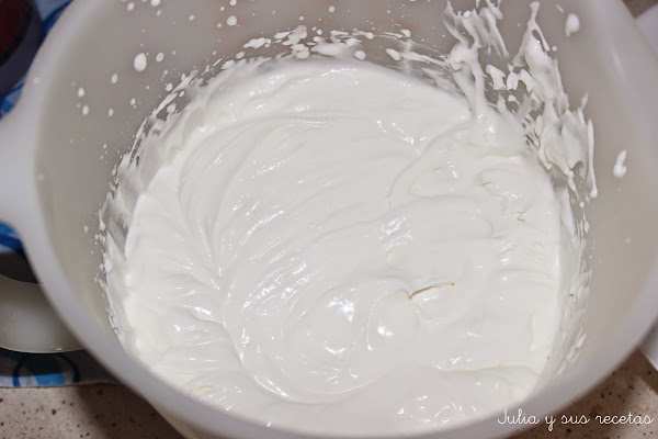 Montamos la nata (crema de leche) y cuando tome consistencia añadimos las tres cucharadas de azúcar glas y seguimos batiendo hasta que se incorpore bien. Le mezclamos con la crème fraîche y mezclamos con las varillas. Lo reservamos.
