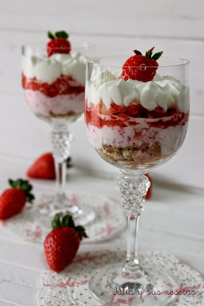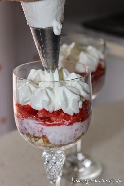 Se sirve en vasos o copas transparentes para poder apreciar las capas. En este caso yo he combinado galletas con capas de fresas trituradas y crème fraîche con nata montada (crema de leche). Una combinación deliciosa y con muy poquitas calorías y sobre todo muy refrescante.