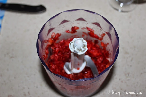 En una picadora ponemos las fresas (dejamos algunas enteras para adornar), y las picamos en trozos pequeñitos.