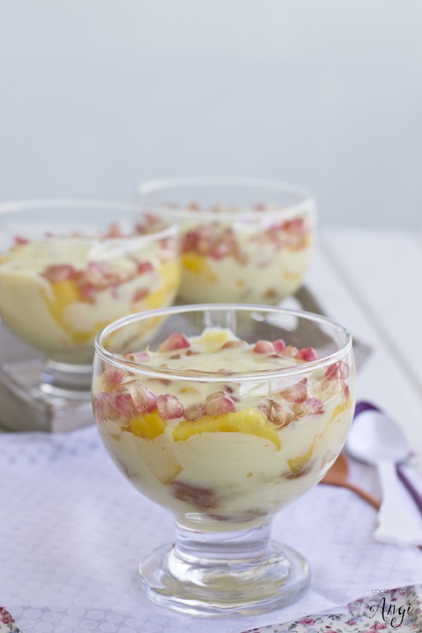 Con este trifle de gofres, mango y granada tan a mi estilo nos trasladamos hoy a Inglaterra ese país que me tira tanto? El trifle consiste en capas alternadas de bizcocho (bañado en algún licor), gelatina de frutas, natillas y como colofón final nata montada (crema de leche). Así que al ver este postre inglés un@ puede pensar que se le ocurrió a aquel a quien le preguntaran: