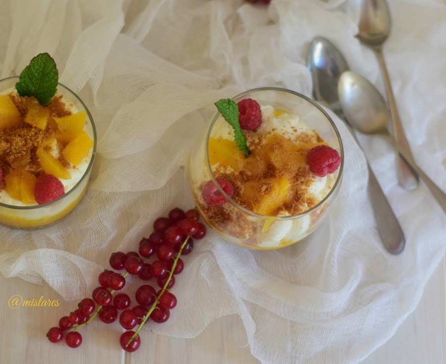 Yo hoy lo he preparado con melocotón de Calanda en almíbar, pero puedes utilizar la fruta que mas te guste o de temporada. Con el mango queda deliciosa y con fresas que estamos ahora en temporada te gustara seguro, añádele al final un poco de ganache de chocolate y a disfrutar ¡¡