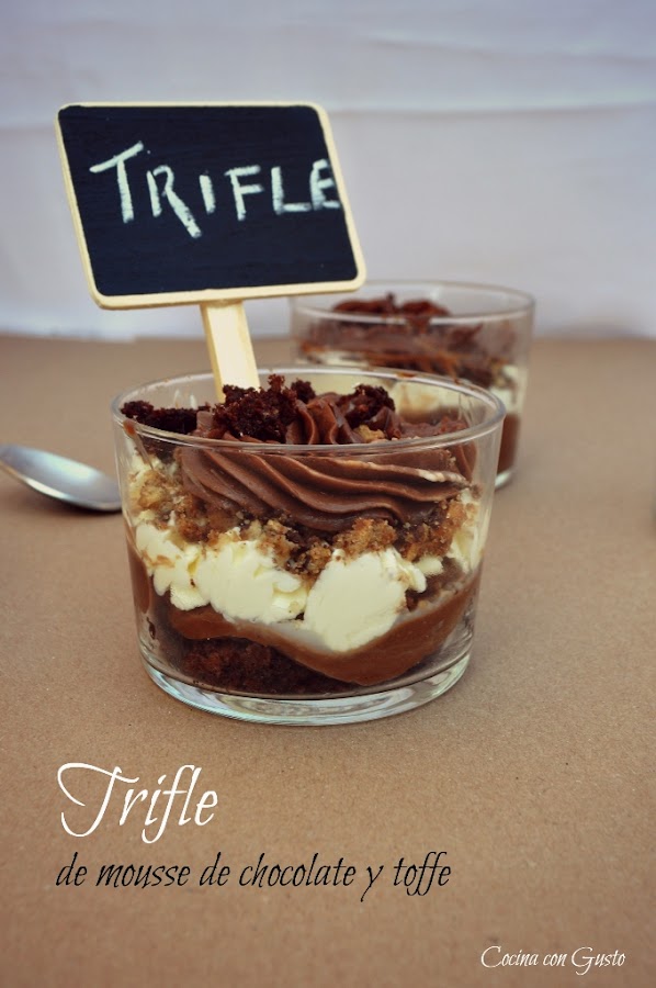 El trifle lleva 5 capas, que era un requisito indispensable: un bizcocho de chocolate casero; mousse de chocolate; nata montada (crema de leche); galletas cookies troceadas; mousse de chocolate; y salsa de toffe como adorno.