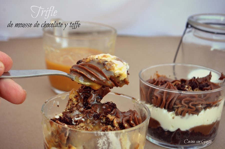 Hace poco descubrí una mousse de chocolate que va perfecta como relleno para preparar una buena tarta de cumpleaños. Las dos últimas las hice con esa mousse y pensé que le iría al pelo. La nata (crema de leche) tenía que es tar presente también y como puntito dulzón añadí una salsa de toffe que siempre da un toque especial a los postres de chocolate. El resultado un contundente trifle que hizo las delicias de cuantos lo probaron.