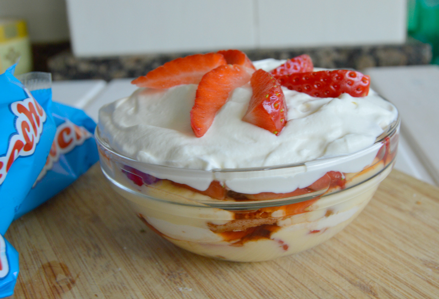 4. Es la hora de montar nuestro postre. Lo mejor es utilizar vasitos individuales, para que quede mejor a la hora de servir. Vamos poniendo una capa de bizcochos troceados, una capa de natillas, una capa de fresas maceradas y una capa de nata montada (crema de leche). Repetimos hasta completar nuestro vasito, intentando acabar con nata montada (crema de leche) para que quede más vistoso.