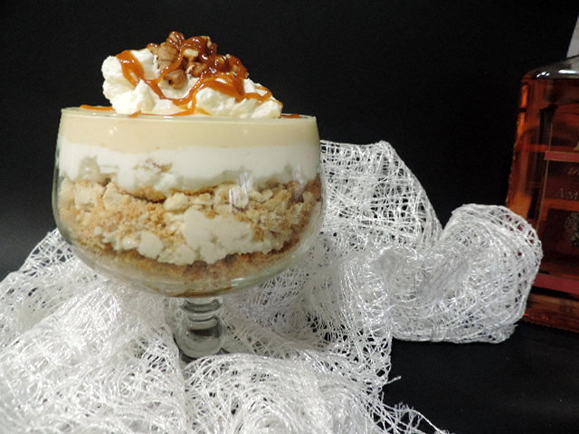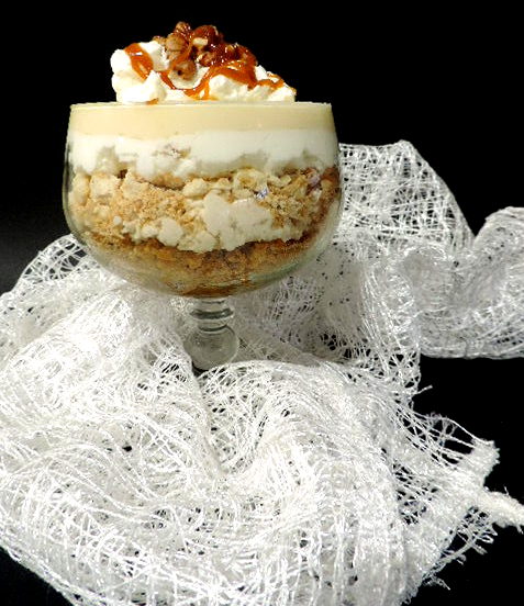 Empezamos el trifle con una base de bizcocho de avena sin azúcar.Seguimos con una capa de mousse a la canela también sin azúcar después unas galletas y avellanas trituradas.Continuamos con una capa de nata montada (crema de leche) y una capa de crema pastelera.Terminamos el trifle con un poco de nata montada (crema de leche) unas nueces troceadas y toffe.Todo ello sin azúcar.