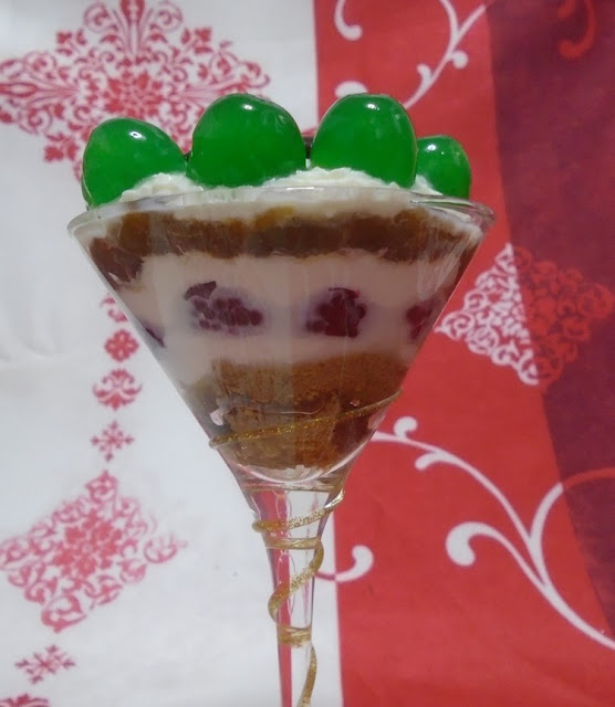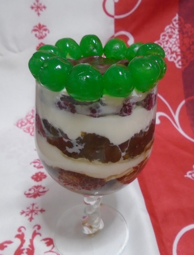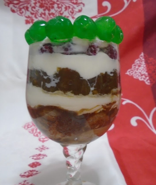 Para mi base humedecí unos bizcochos de soletilla en café, La siguiente capa puede ser de fruta natural, en almíbar, mermelada de frutas, confitada, yo elegí la opción de manzanas caramelizadas y flambeadas con ron. Sobre estas capas la nata (crema de leche), para darle más vistosidad, hay más opciones como unas natillas, flan, crema de mascarpone, y finalmente terminamos la decoración con frutos secos, fruta natural o galletas desmigadas, mi opción para terminar el Trifle fue unas guindas y una pequeña capa de chocolate, también hice otra opción en vez de guindas, gajos de mandarina, eso si tuve dos fallos uno que no le dí el efecto que yo deseaba ya que la base de bizcochos y las manzanas caramelizadas tenían el mismo color, por eso cambie de copa y de presentación, puse los bizcochos, las moras y por último las manzanas caramelizadas, un postre con tantas opciones y coloridos y no me dí cuenta al pensar los ingredientes con los que iba a prepararlos, segundo fallo, el chocolate al ser un postre que debe permanecer en el frigorífico antes de servirlo para que todos los sabores se integren, se quedo endurecido, con lo cual no supe darle esa vistosidad, que requiere la elaboración del Trifle.