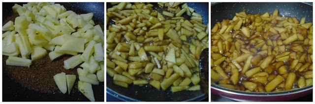 En un recipiente añadimos el azúcar moreno y cuando empiece a derretirse añadimos las manzanas.