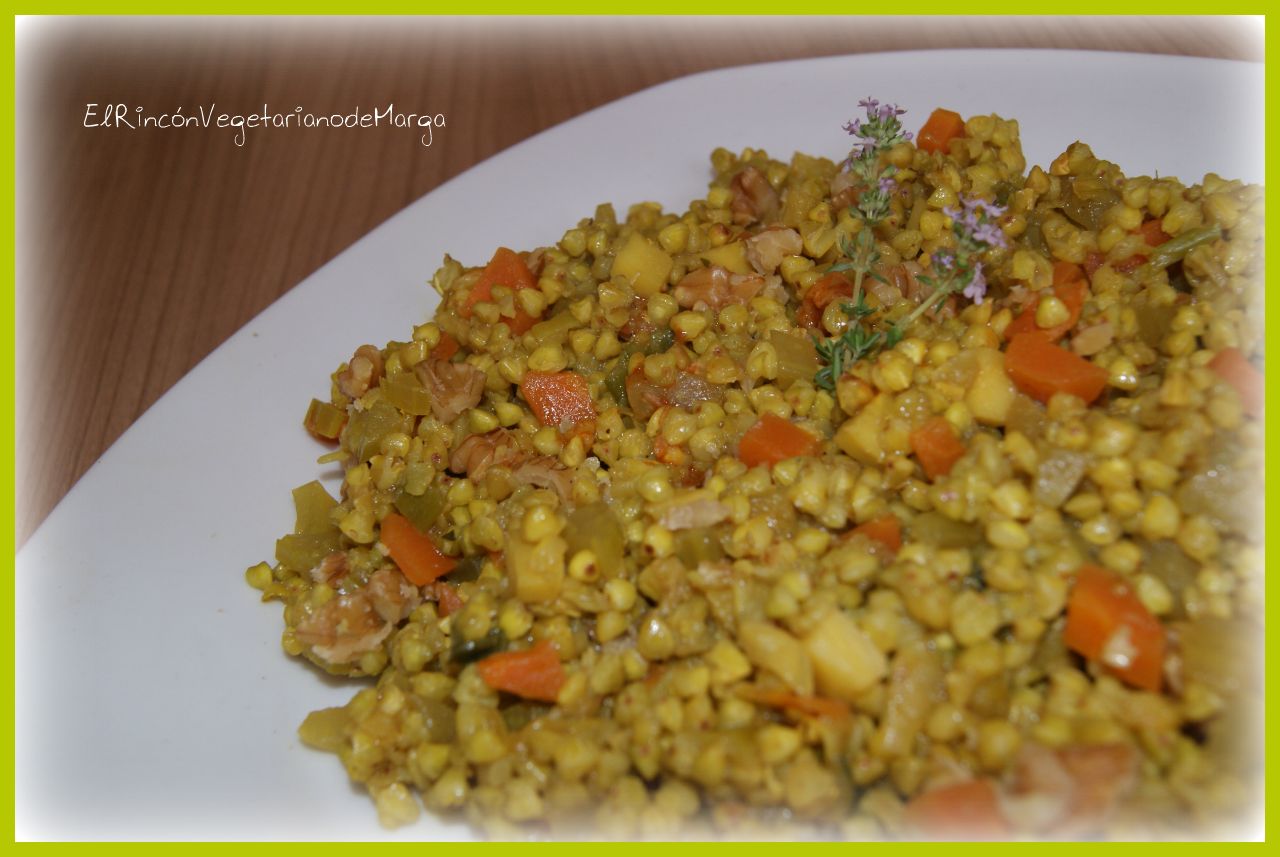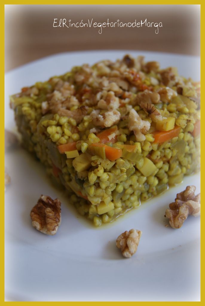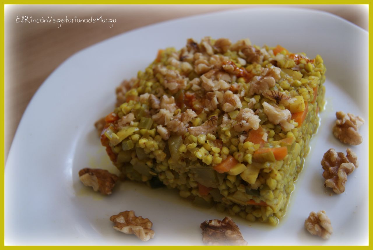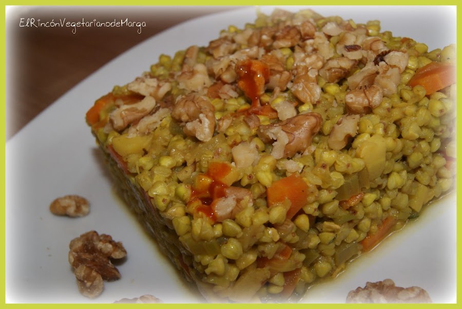 Picar la cebolleta, el apio, el trozo de chirivía y la zanahoria y rehogarlo en una sartén con un buen chorro de aceite de oliva. Cuando empiece a dorarse añadimos un buen chorro de salsa de soja y el caldo vegetal. Cuando rompa a ebullición, añadimos desmigada la pastilla de caldo vegetal, la cúrcuma, la pimienta negra y el trigo sarraceno. Cocinar durante 10 minutos aproximadamente, hasta que veamos el trigo tierno. Apartar del fuego e incorporar las nueces desmigadas. Dejar reposar y servir. Unas gotas de tabasco por encima le da un toque genial.