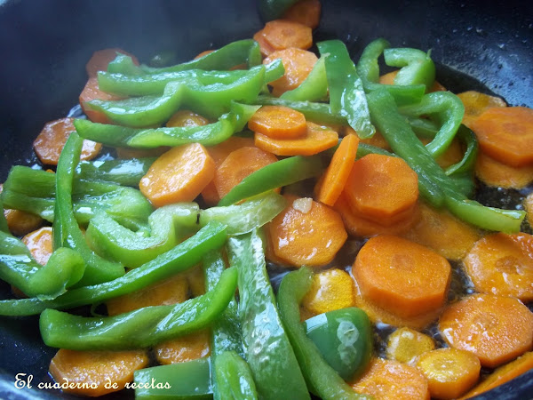 Ponemos aceite en una sartén {6 cdas} y añadimos las verduras.