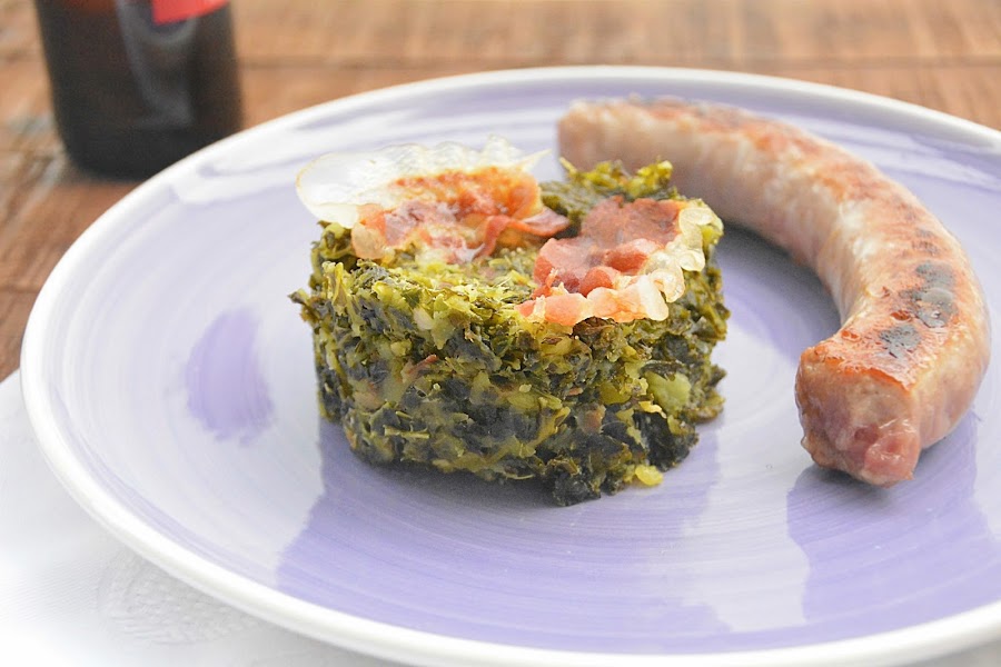 En la misma sartén donde hemos frito la panceta y el ajito, le añadimos la patata y la col kale machacados. Salteamos todo junto durante unos 3-4 minutos mientras vamos machacándolo todo con una cuchara de madera.