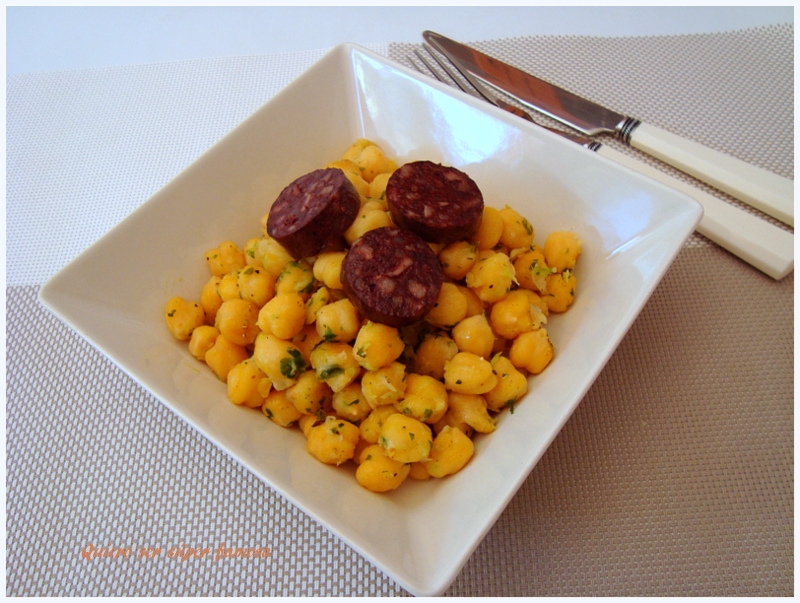 Yo recomendaría cocer los garbanzos en casa siempre. Pero en el caso de que tengáis por costumbre utilizar los envasados aseguraros de que no sean duros por dentro. A veces el fabricante los deja algo enteros porque prevé que puedan ser utilizados para guisar. Si es el caso, escurrir el agua del bote y hervir de nuevo con una hojita de laurel y un poco de sal, durante unos diez minutos. Luego escurrir bien, porque para saltear en la sartén deben tener la menor humedad posible. Incluso los platos más sencillos tienen sus pequeños secretos.