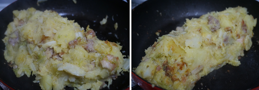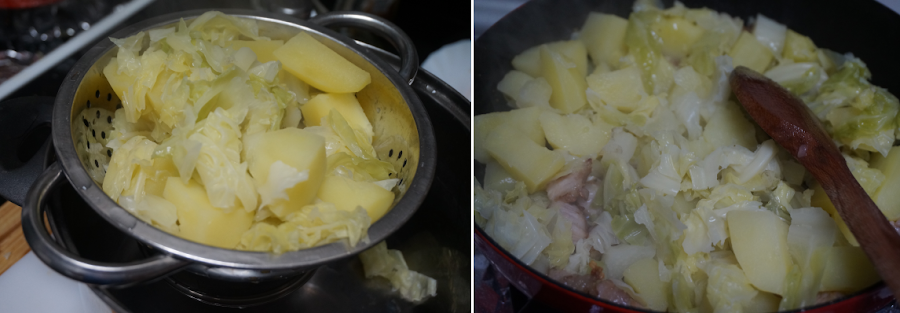 Cuando esté la col con las patatas, sacamos y escurrimos bien. Cuando esté la panceta dorada añadimos la col y las patatas. Con ayuda de una cuchara de madera iremos troceando y mezclando todo bien.