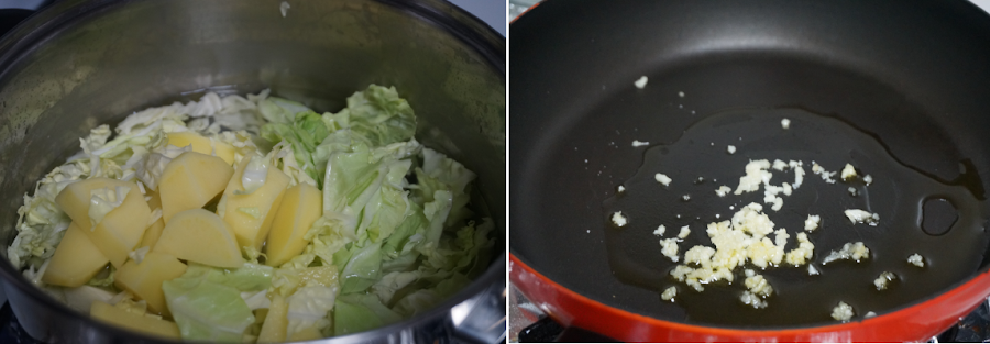 Ponemos una olla al fuego con agua y un poco de sal, añadimos la col troceada y las patatas. Lo dejamos cocer hasta que queden bien cocido. Por otro lado mientras se cuecen las verduras picamos los ajos, se pueden cortar en láminas en trozos pequeños, picaremos 3 dientes de ajos.