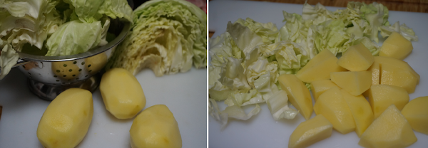 Limpiaremos la col, quitaremos las hojas más gruesas, troceamos en trozos medianos y lavamos bien. Pelamos y cortamos las patatas.