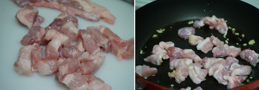 Cortamos en trozos la panceta. Ponemos una sartén amplia al fuego con un chorro de aceite, añadimos los ajos y la panceta cortada en trozos. Dejamos dorar la carne.