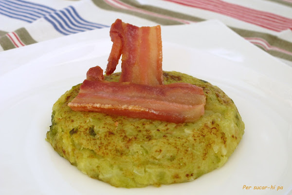 El trinxat ya está listo para servir, acompañado de las lonchas de panceta que hemos reservado. En esta ocasión le hemos dado un acabado tostadito, pasándolo por la sartén con un poco de aceite, con la ayuda de un aro para darle forma (opcional, se puede hacer sin este utensilio). Se emplata acompañado por la panceta crujiente.