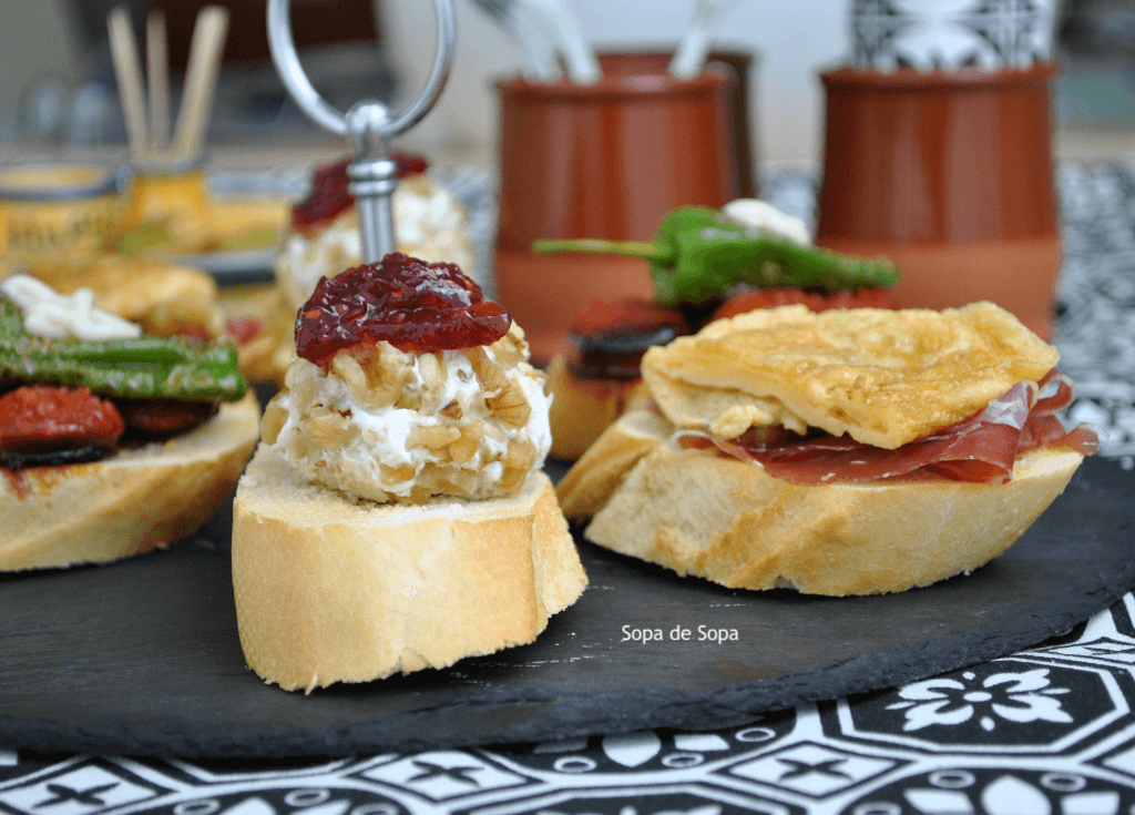 Montaje: Poner en 4 rebanadas el jamón serrano, la cebolla caramelizada y un trozo de tortilla.