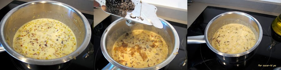 Verter la nata (crema de leche) líquida y salpimentar al gusto. Cocer brevemente hasta que la salsa coja cuerpo y espese ligeramente. Podemos acabar de redondear la salsa añadiendo un poco de trufa, aunque es opcional, está riquísima sin ella. Remover, retirar y reservar.
