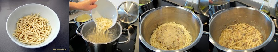 Poner una olla al fuego con abundante agua, cuando hierva añadir la sal y los trofie, cuando vuelva a hervir contar el tiempo de cocción que marque el fabricante. Cocer la pasta al dente, retirar del fuego y escurrir bien el agua de cocción, reservar un poco por si necesitamos aclarar la salsa. Colocar en la cazuela y tirar por encima la salsa, remover bien para repartirla y servir caliente.