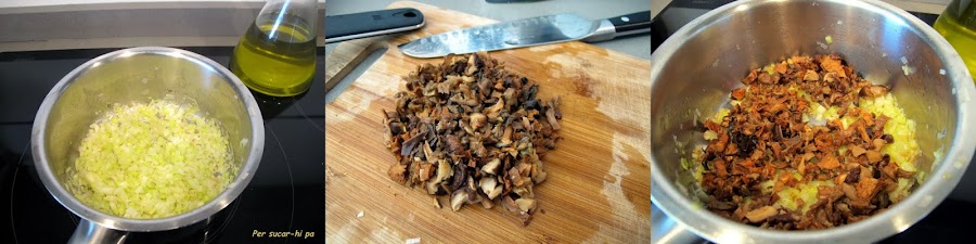 Escurrir las setas, picarlas muy fino a cuchillo, y añadir al puerro. Rehogarlas un par de minutos.