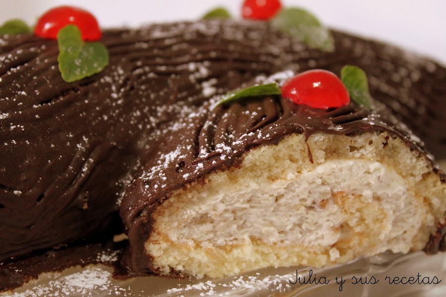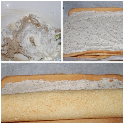 Humedecemos el bizcocho con el almíbar y lo rellenamos con la mousse de castañas. Lo enrollamos. Le cortamos un trozo del principio y lo pegamos con un poco de mousse a un lateral del brazo imitando un tronco.