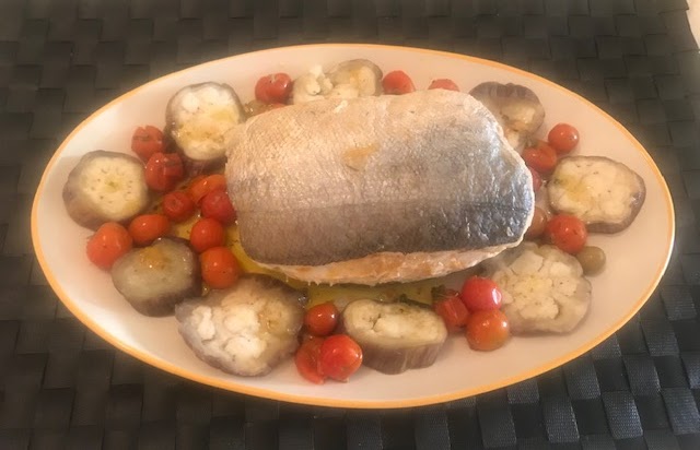 Pon con el sofrito el fumet reservado, la sal y la pimienta. Coloca el Varoma en su posición y cocina 20min/Varoma/vel2 (mi tronco era muy gordo y no estaba hecho del todo, le he dado la vuelta y he añadido 100 gramos de agua y programado 7min/varoma/vel2). Reserva el varoma tapado para mantener el pescado caliente.
