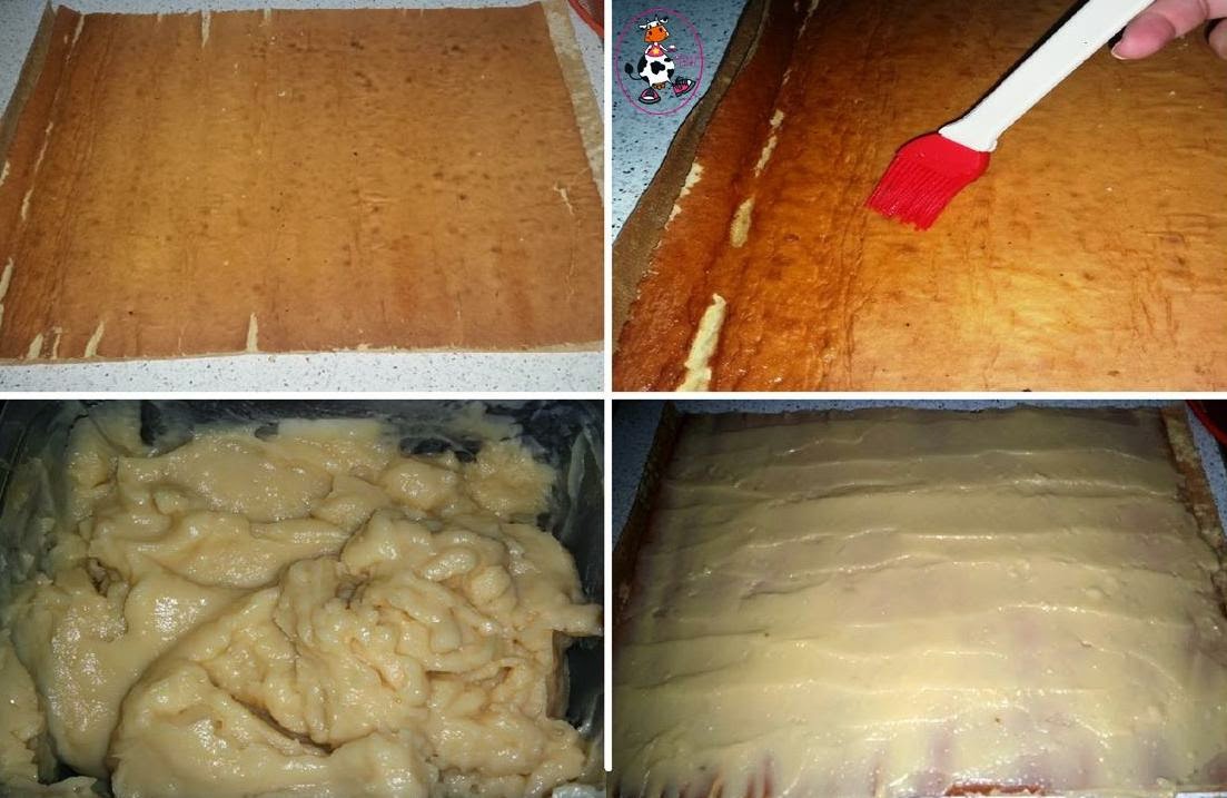 Estiramos el bizcocho y con la ayuda de un pincel pintamos con el almibar y encima ponemos la crema pastelera. Enrollamos con cuidado el bizcocho.