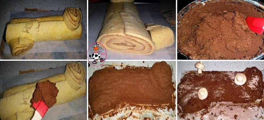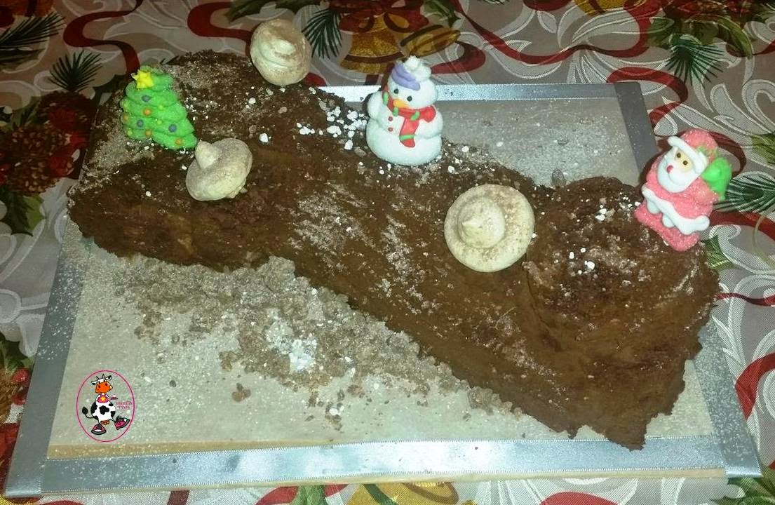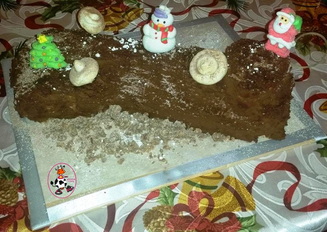 Cortamos dos trozos del bizcocho y colocamos como queramos para dar forma a nuestro tronco. Hacemos la ganache de chocolate. Ponemos un caldero al fuego y añadimos la nata (crema de leche),cuando empiece a hervir añadimos los trozos de chocolate y removemos hasta que se deshaga y mezcle bien,una vez este fundido apagamos el fuego y dejamos enfriar. Una vez frio con la batidora de varillas batimos. Con la ayuda de una espatula vamos cubriendo el tronco de chocolate.Cuando este todo cubierto de chocolate metemos en la nevera y dejamos enfriar. Cuando este bien frio podemos empezar a decorar,yo espolvoree azucar glass y cacao en polvo,hice unos champiñones de merengue y coloque unas chuches de navidad. Por los lados puse trocitos de turron de chocolate.