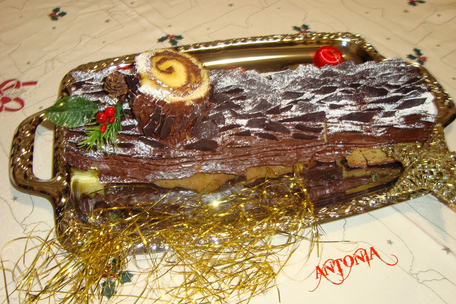 /:\ TRONCO DE NAVIDAD CON FRUTAS /:\ INGREDIENTES /:\ 100 gr. de azúcar piel de naranja y limón 500 gr. de leche 50 gr. de maizena 3 huevos 1 manzana 1 pera 1 plátano PARA EL ALMÍBAR /:\ 250 gr. de azúcar 250 gr. de agua 50 gr. de anís seco 1 cucharilla de azúcar vainillado PARA EL BIZCOCHO /:\ 6 huevos el peso de 5 huevos de harina y azúcar 1 sobre y medio de levadura ralladura de limón con esta cantidad me salieron de planchas de bizcocho, y según sean las bandejas, como me sobro una , la otra la congele para cuando me haga falta . PARA LA COBERTURA /:\ 150 gr. de chocolate 1 hoja de gelatina PREPARACIÓN /:\ Separar las claras de las yemas, batir a punto nieve reservar batimos las yemas con el azúcar, le ponemos ralladura de limón le echamos las claras a punto nieve y mezclar suave, incorporamos la harina tamizada con la levadura y vamos mezclando, forramos la bandeja con papel vegetal y horneamos en el horno a 180º , una vez que el bizcocho lo hayamos sacado del horno lo espolvoreamos con azúcar y dejamos enfriar , hacemos el almíbar poniendo todo los ingredientes en el vaso de la thermomix , 6 min. varoma , vl 2, retirar y reservar. Hacer la crema pulverizar las pieles de limón y naranja con el azúcar 30 seg. vl progresiva 5-10, echar la leche la maizena y los huevos programar 7 min. 90º vl 4, reservar esta crema. Hacer el almíbar con la frutas , picar en trocitos pequeños y echarle un poco de zumo de limón para que no oscurezcan , poner en un cazo la mantequilla y el azúcar y cuando este derretido le echamos las frutas y la esencia de vainilla , cuando coja color de caramelo apartar y mezclar con la crema, extendemos esta crema en la plancha del bizcocho ya bañada con el almíbar, enrollamos el bizcocho dándole forma de brazo gitano. Hacer una cobertura de chocolate, partimos en trocitos 150 gr. de chocolate y en un bol metemos en el microondas 3 min.sacamos y movemos hasta ver que esta bien derretido ,le puse una hoja de gelatina deshidratada y bien escurrida y la mezcle con el chocolate, y bañe con esta cobertura el brazo de gitano , decorar como mas nos guste , en mi caso con escamas de chocolate que hice, derritiendo el chocolate y poniéndolo en papel vegetal y extendiéndolo en una capa muy fina y una vez que endureció lo partir en trocitos pequeños y echándole encima azúcar glasé el resultado muy bonito y super bueno bueno *********************************************** ****************************************