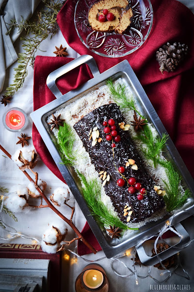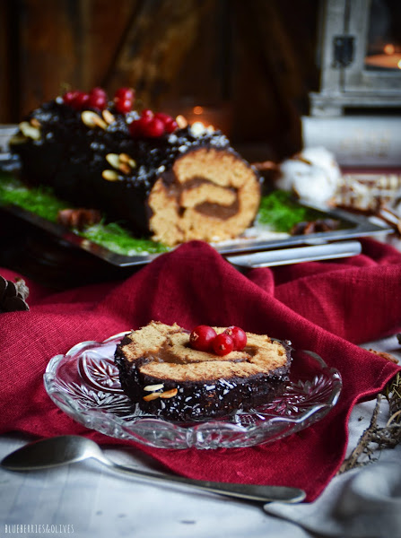 La verdad es que es un postre bastante sencillo de hacer y el resultado es muy satisfactorio, queda súper bonito, original, y muy navideño. Consiste en hacer una especie de "brazo gitano" con un bizcocho muy fino y después de enrollarlo decorarlo de la manera que más nos guste. A mi me gusta el aspecto rústico que le da el cacao oscuro como si fuera un tronco de madera, y lo espolvoreo con coco rallado como si estuviera nevado, unas almendras laminadas y por último decoro con unas grosellas para dar un toque de color...
