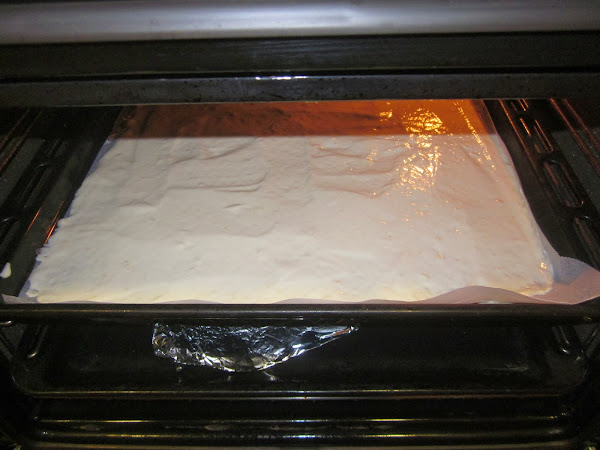 Nos tiene que quedar un bizcocho blanco, por eso hay que vigilar el horno, si se hace mucho se romperá al enrollarlo.