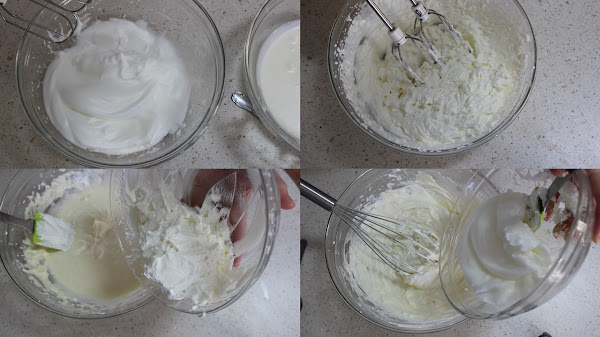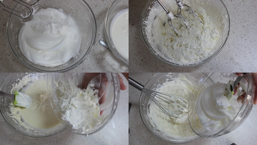 Montamos la nata (crema de leche) con las varillas hasta que esté espesa. La añadimos al queso mascarpone con movimientos envolventes hasta que esté bien mezclada. Incorporamos las claras montadas con movimientos envolventes.