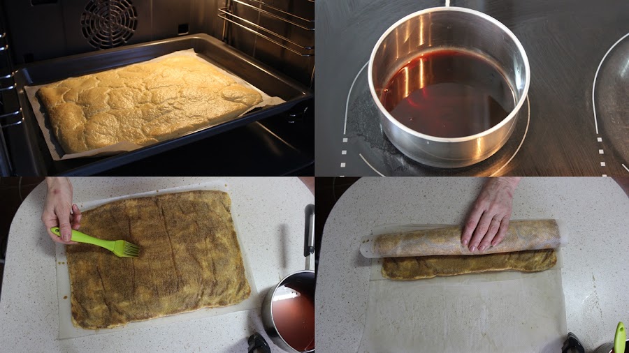 Hacemos el bizcocho como dice la receta. Lo dejamos enfriar enrollado para que tome forma de rollo.