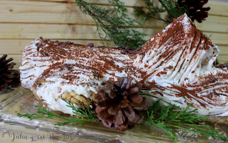El tiramisú es uno de los postres favoritos en mi casa. Nos gusta a todos. Por eso este año, y para cambiar un poquito la forma de presentarlo, lo he hecho en forma de tronco de navidad.