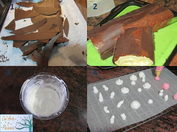 Sacamos del frigorífico el chocolate para la corteza, con la mano lo vamos rompiendo en trozos alargados e irregulares,. (foto 1). Con arte y paciencia, vamos pegando los trocitos cubriéndolo todo y conformando la corteza de nuestro tronco, podemos ayudarnos del betún para pegar trocitos en sitios más complicados (foto2)