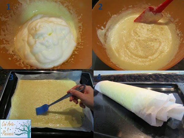 Separamos las claras de las yemas. Con la batidora de varillas, batimos las claras a punto de nieve (foto 1). Por otro lado, añadimos azúcar a las yemas y batimos hasta que blanqueen, Después, las juntamos en un bol, junto con una pizca de sal y un poquito de levadura en polvo, lo mezclamos pero sin batir, con movimientos envolventes y procurando que no se pierda la textura esponjosa de la mezcla, después incorporamos poco a poco la harina, tamizándola con un tamizador o un colador (foto 2).