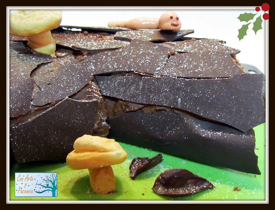 Colocamos setas entre los huecos de la corteza del tronco y también sobre el fondo de bandeja. También ponemos las hojitas de chocolate y cualquier otro detalle que se nos ocurra. Después espolvoreamos las setas con un poco de cacao en polvo y todo el conjunto con azúcar glass para dar al conjunto aspecto de nevado.