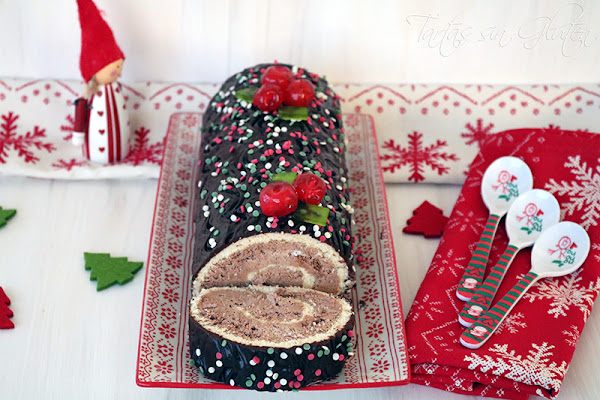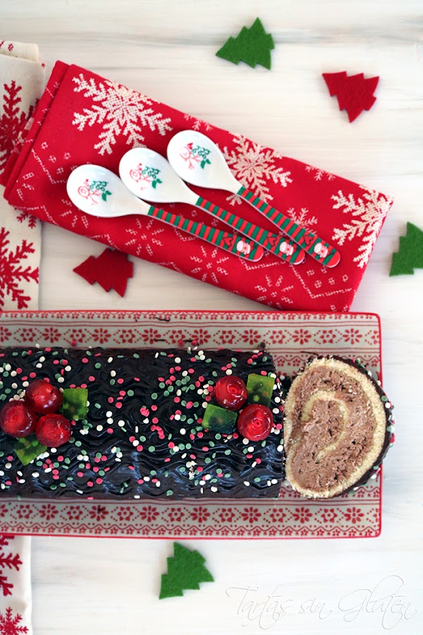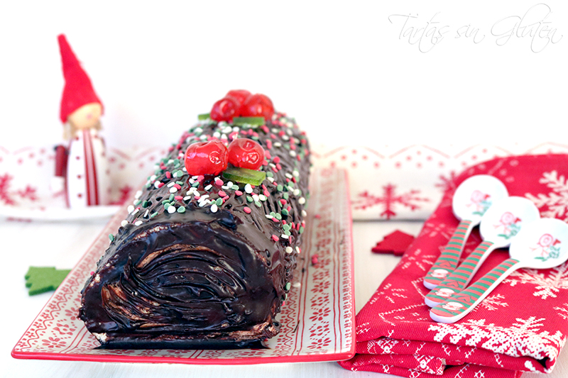 Recortamos las puntas del rollo para que queden rectas y cubrimos con la cobertura, yo lo hago con una brocha de silicona. Deja reposar unos 10 minutos y con la ayuda de un tenedor, hacemos lineas onduladas típicas de un tronco. Decoramos con los sprinkles y frutas.