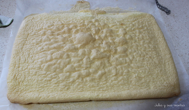 Hacemos el bizcocho como dice la receta (aquí). Lo dejamos enfriar.