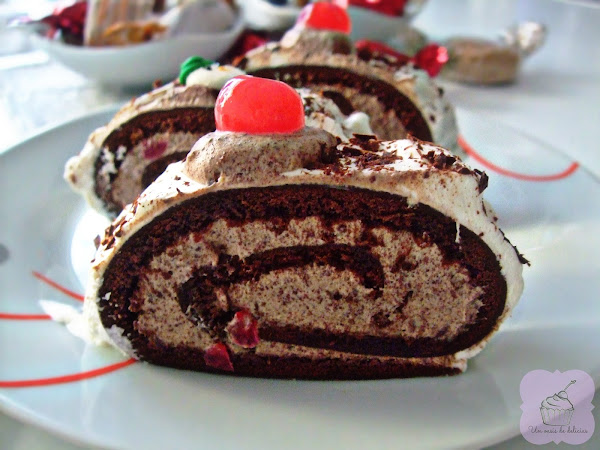 8° Decoramos el tronco con el resto de mousse de chocolate y de cerezas. Podemos también decorarlo con decoraciones de Navidad de azúcar.