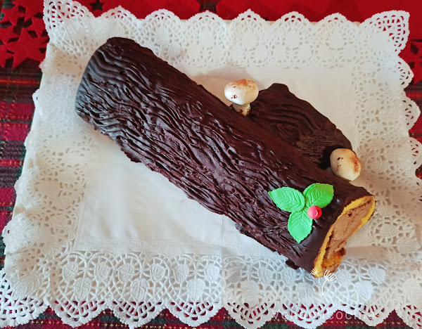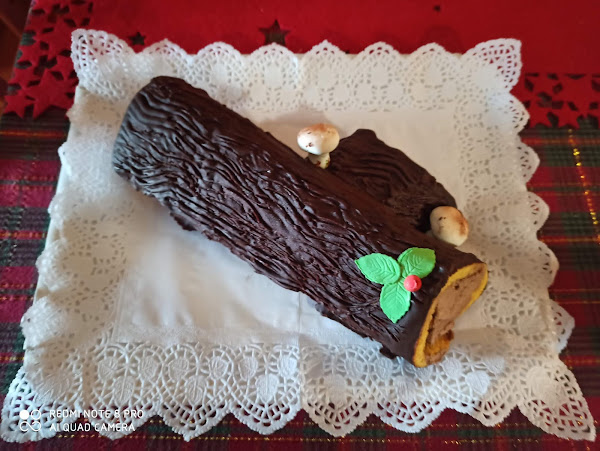 Mezcla bien , y rellena con ella el bizcocho ya frío. Vuelve a enrollar con cuidado de que no se rompa. Corta un trozo en diagonal, para pegarlo encima, como si fuese una rama.